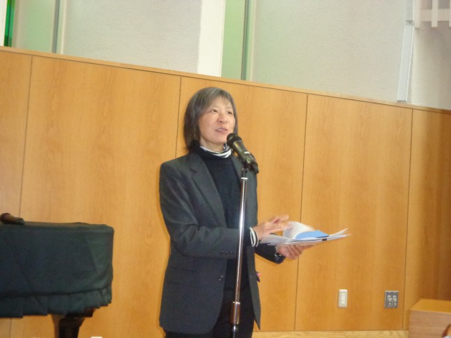 | 講師の紹介をする町田さとみ地区書記(初雁教会牧師) |